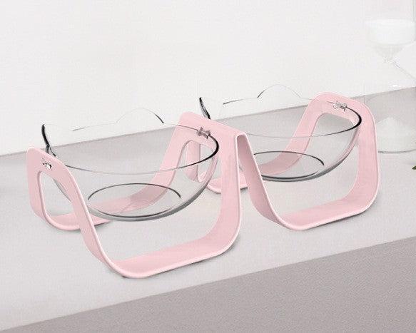 Comedero doble elevado, con la base en material plástico de alta resistencia y platos en forma de cara de gato en Acrílico transparente, con inclinación de 15 grados para generar una mejor posición a la hora de comer. Material resistente y desarmable para lavar fácilmente; apto para gatos y perros pequeños.