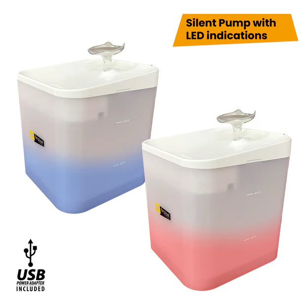 Equipada con una bomba eléctrica de bajo voltaje (5 V), la fuente garantiza un funcionamiento seguro. Un sensor de nivel desconecta automáticamente la bomba cuando el nivel de agua es demasiado bajo, lo que garantiza una larga vida útil del producto.